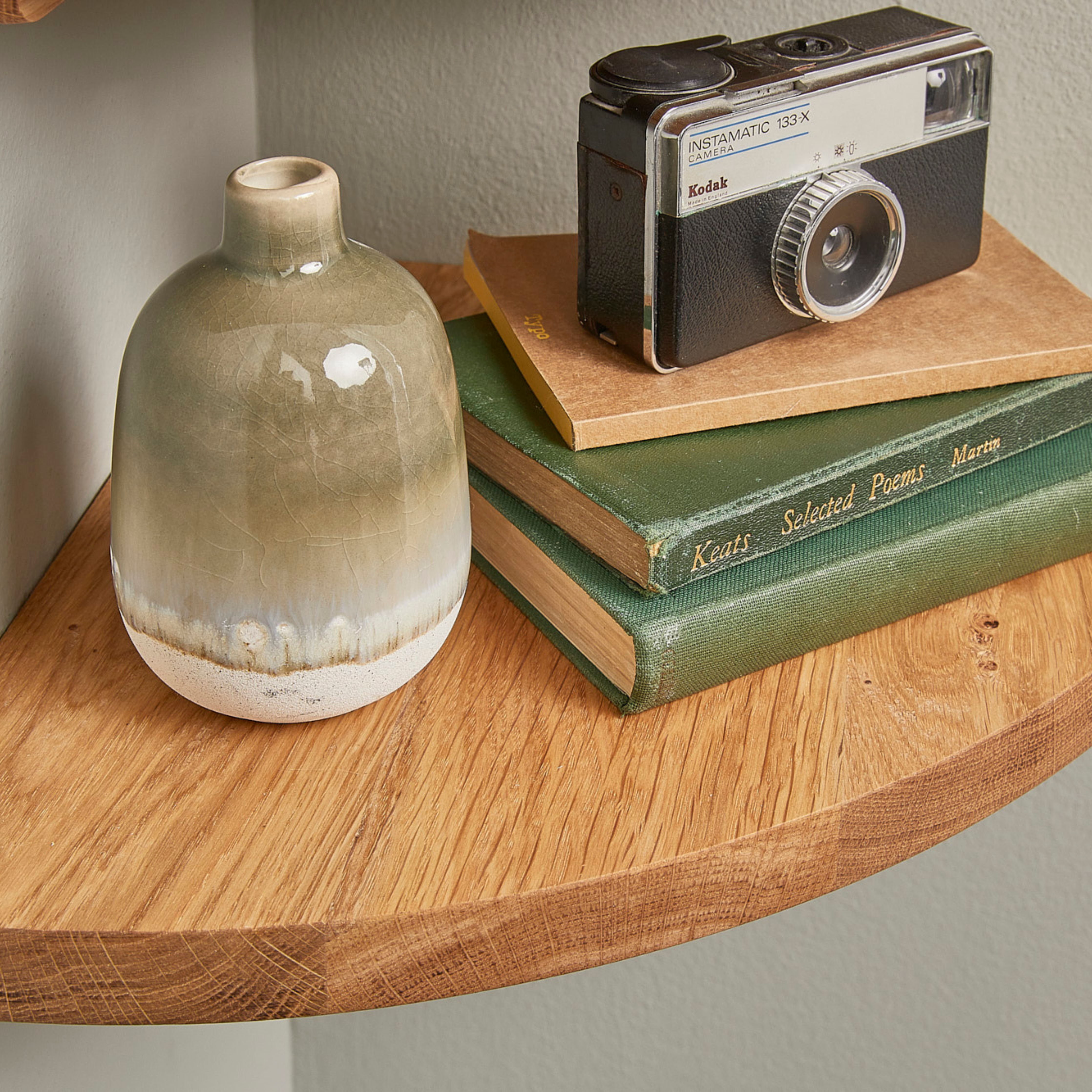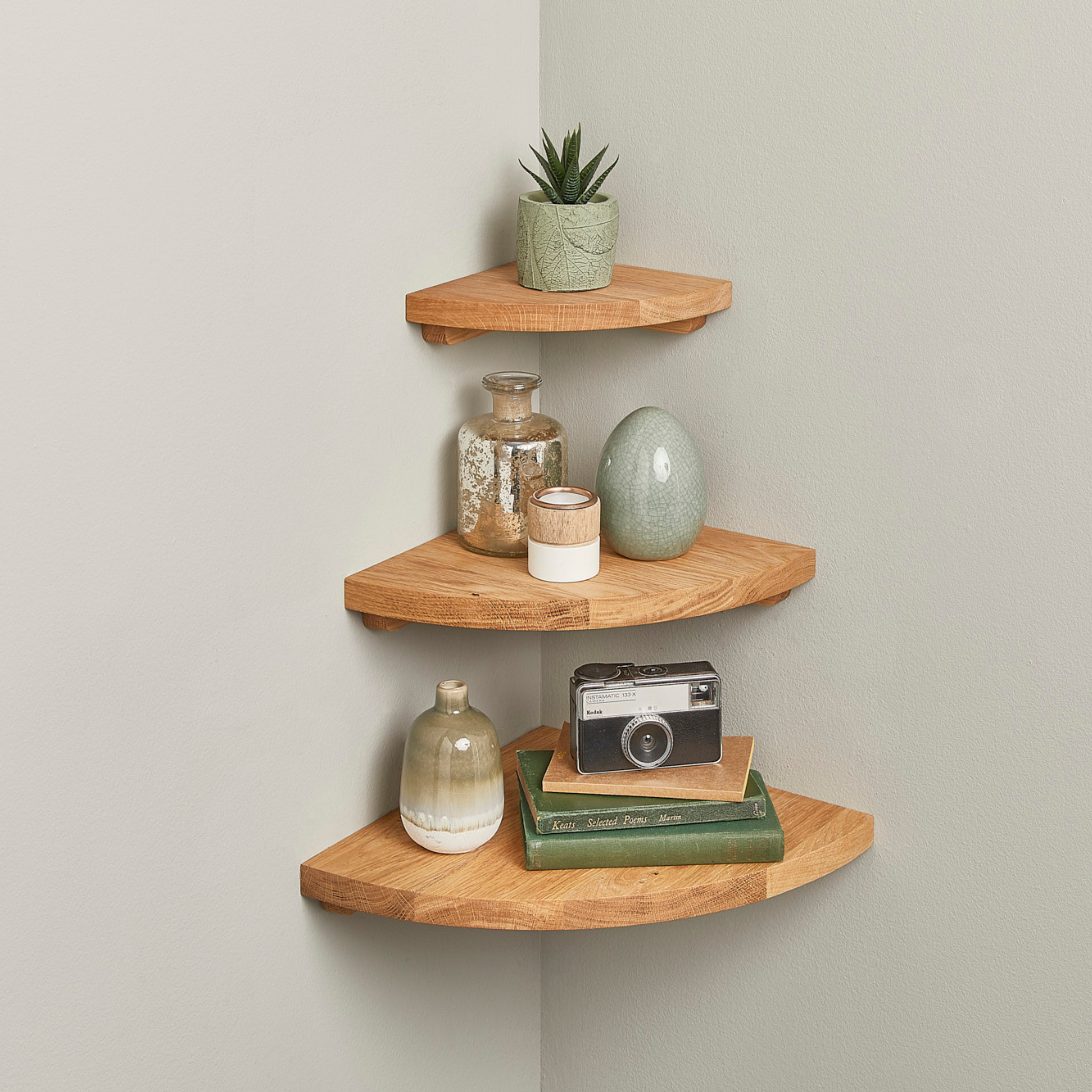 This oak corner shelf is a simple and practical way to make use of unused corner space while keeping a clean, understated look. Handmade from solid oak, each shelf is finished to highlight the natural grain and warm tones of the wood, giving you a piece that feels solid, well made, and timeless. This oak corner shelf is designed to create practical storage in unused corners while keeping a clean, floating look.