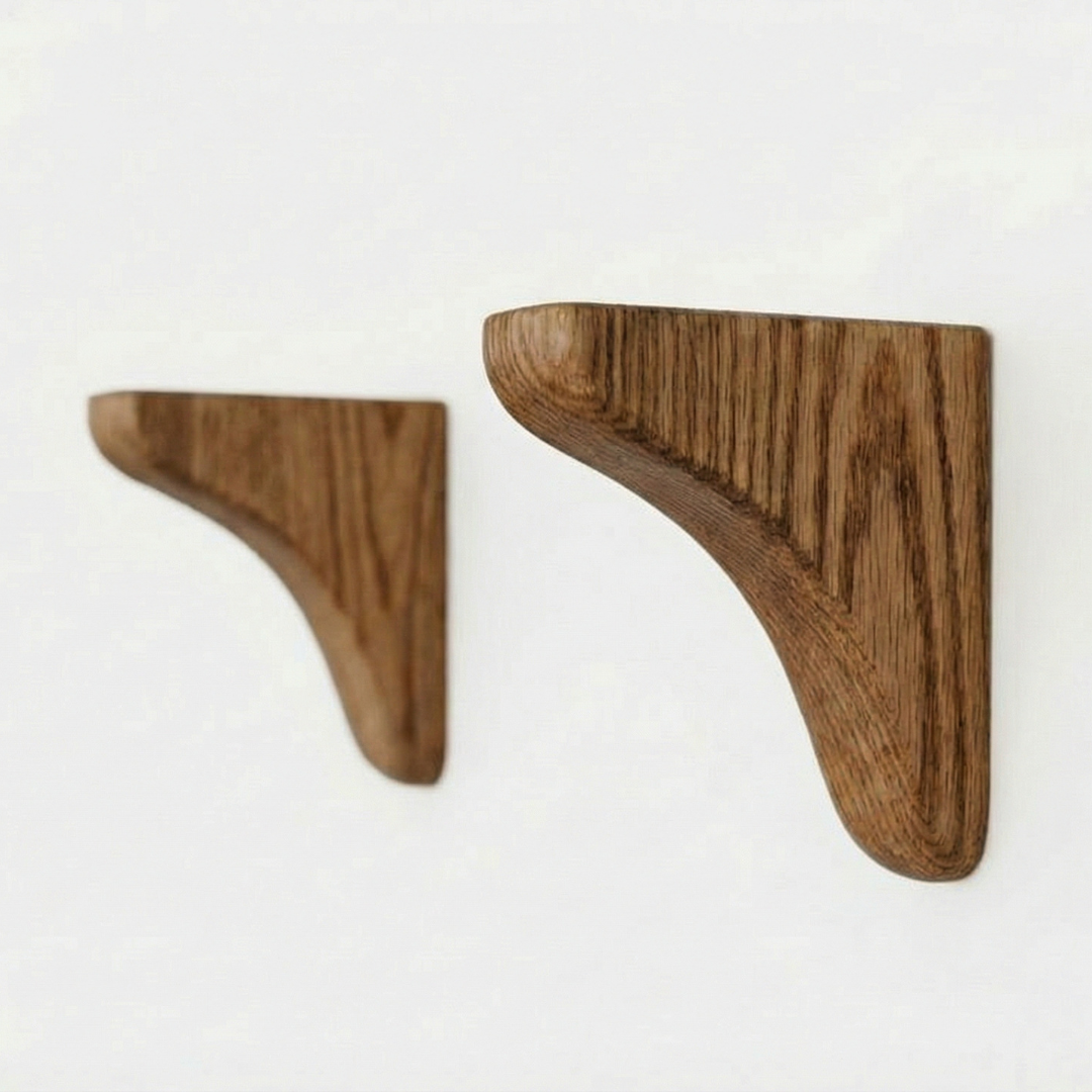 This solid oak wall shelf is supplied with a matching pair of wooden brackets, made alongside the shelf in our Yorkshire workshop. The visible wooden brackets give the shelf a traditional feel while providing dependable support for everyday storage.