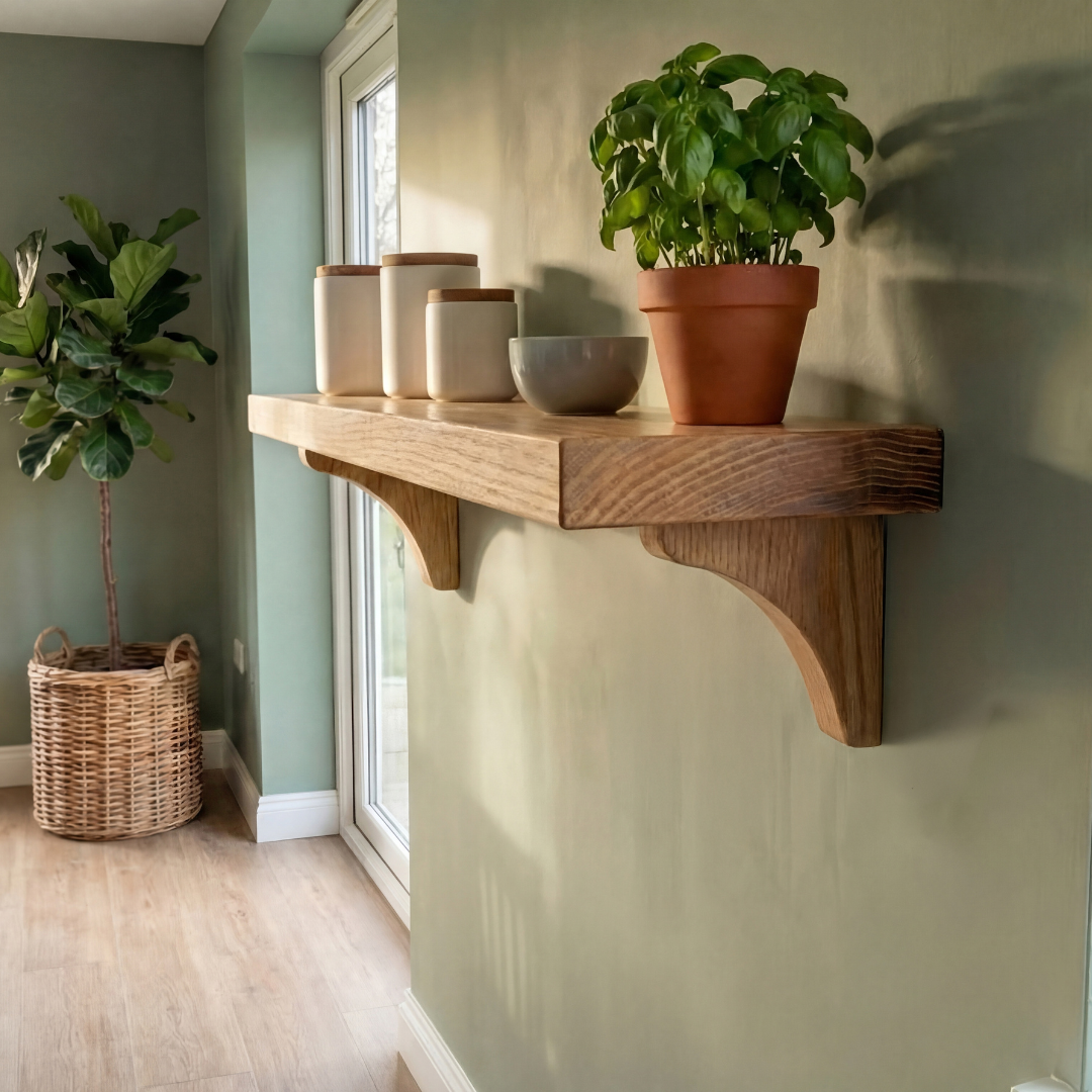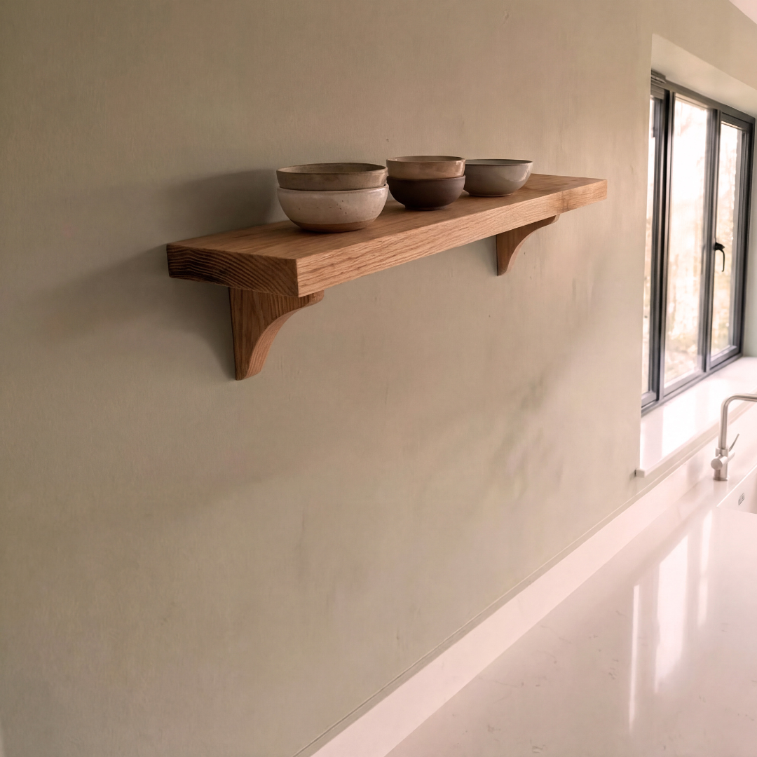 - Oak shelf with wooden brackets, handmade in our Yorkshire workshop