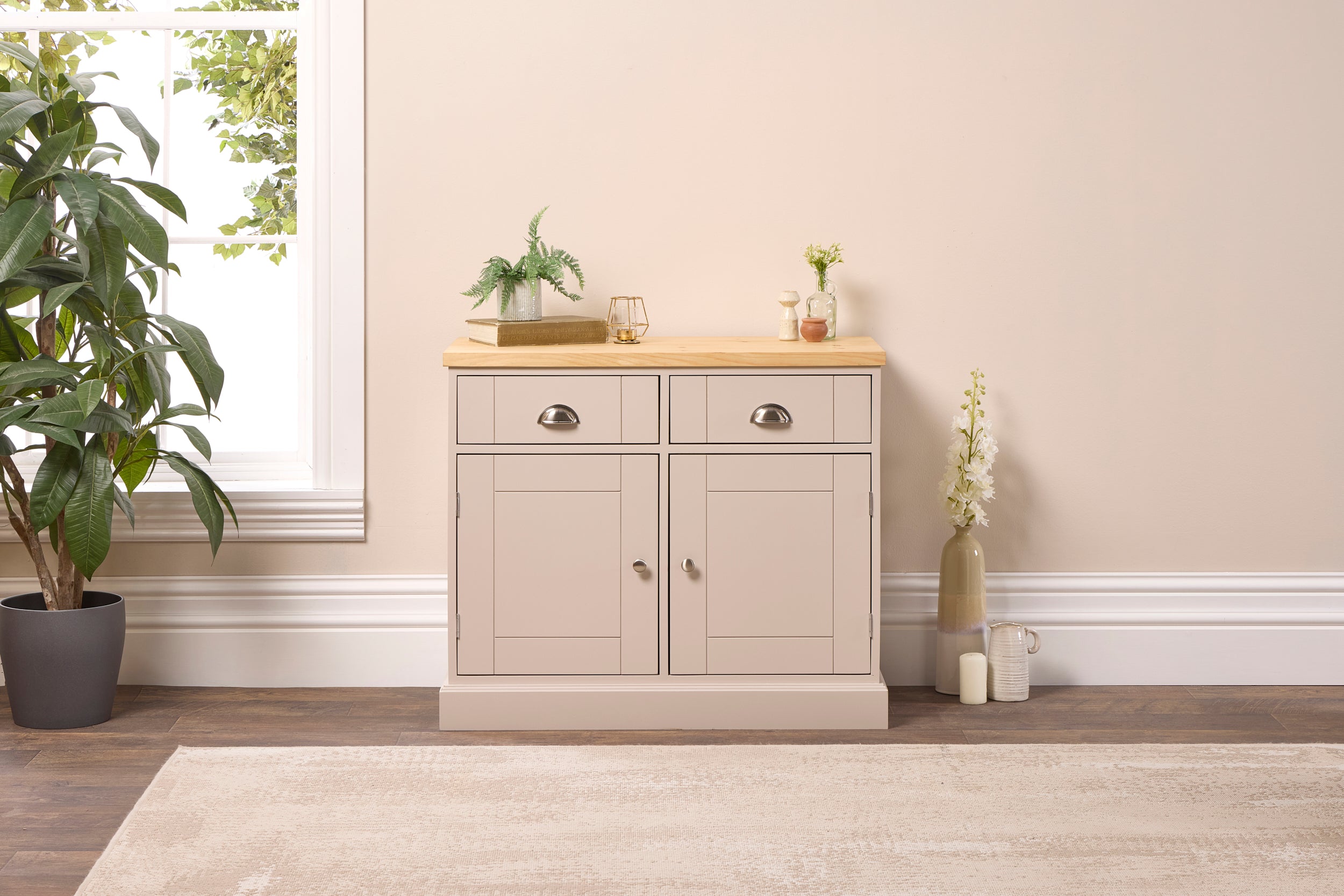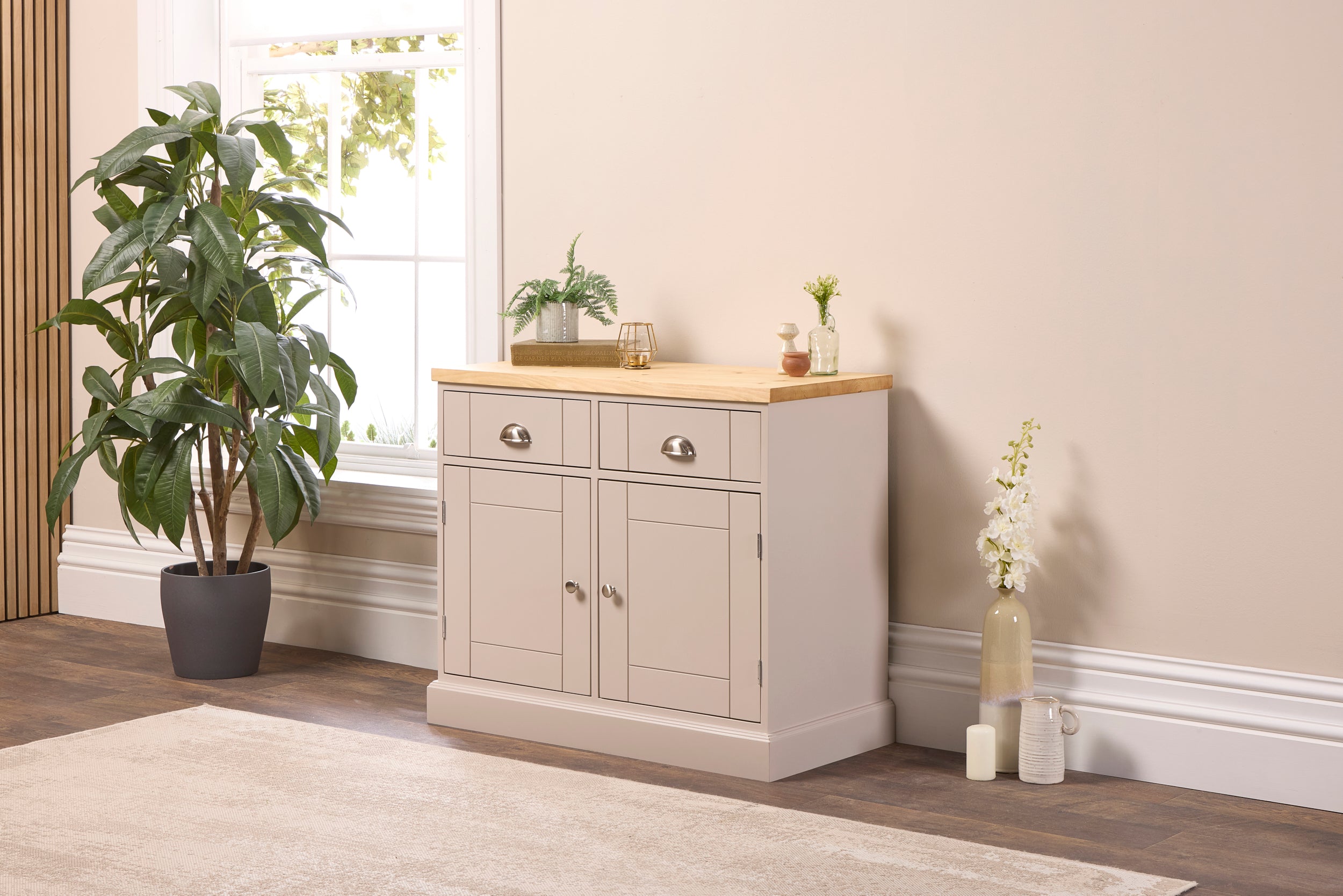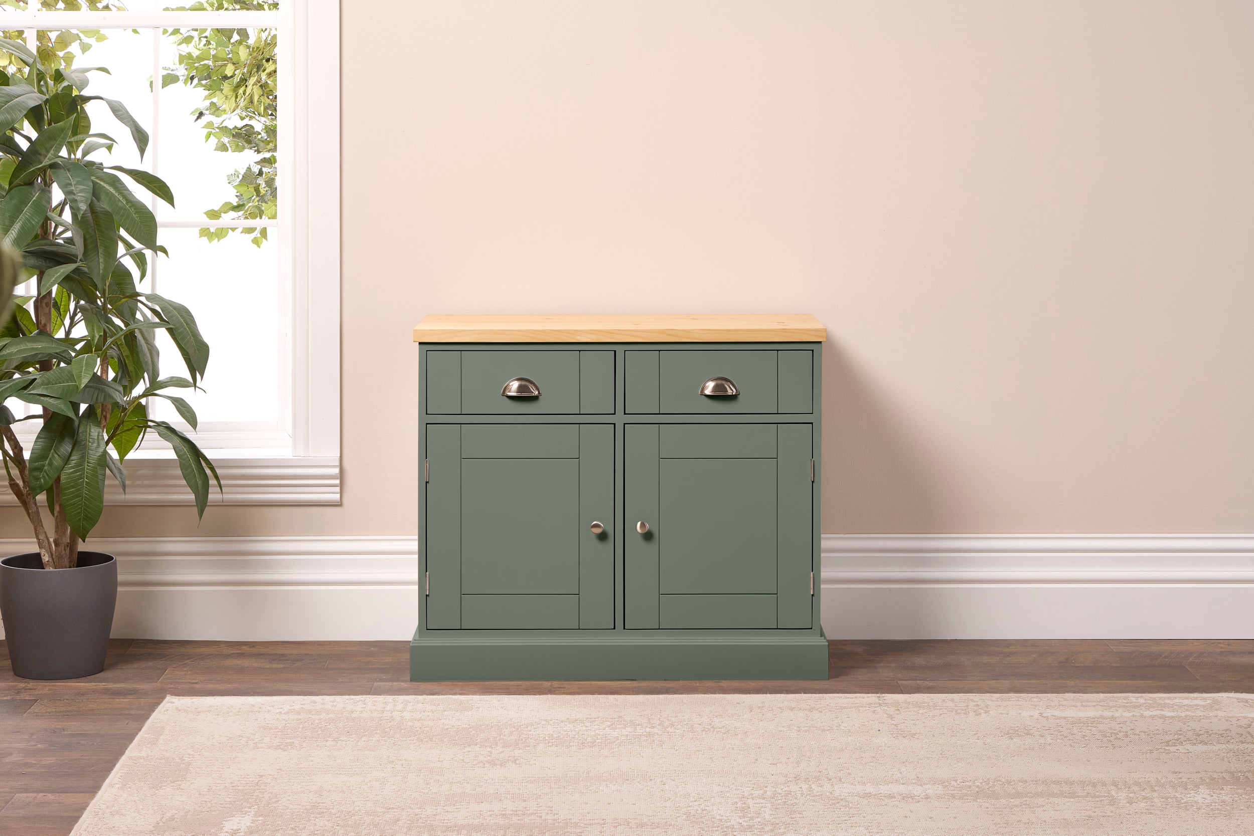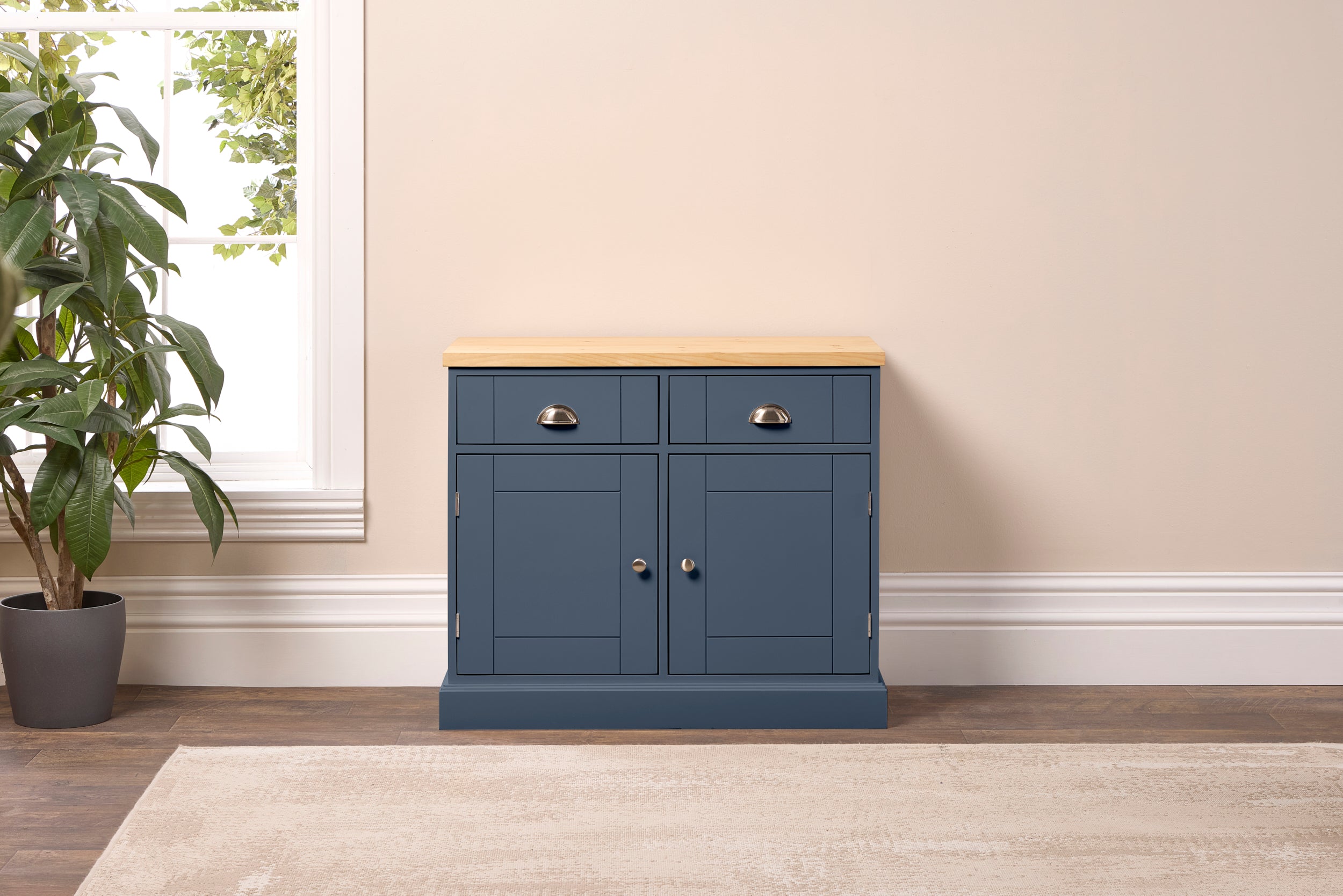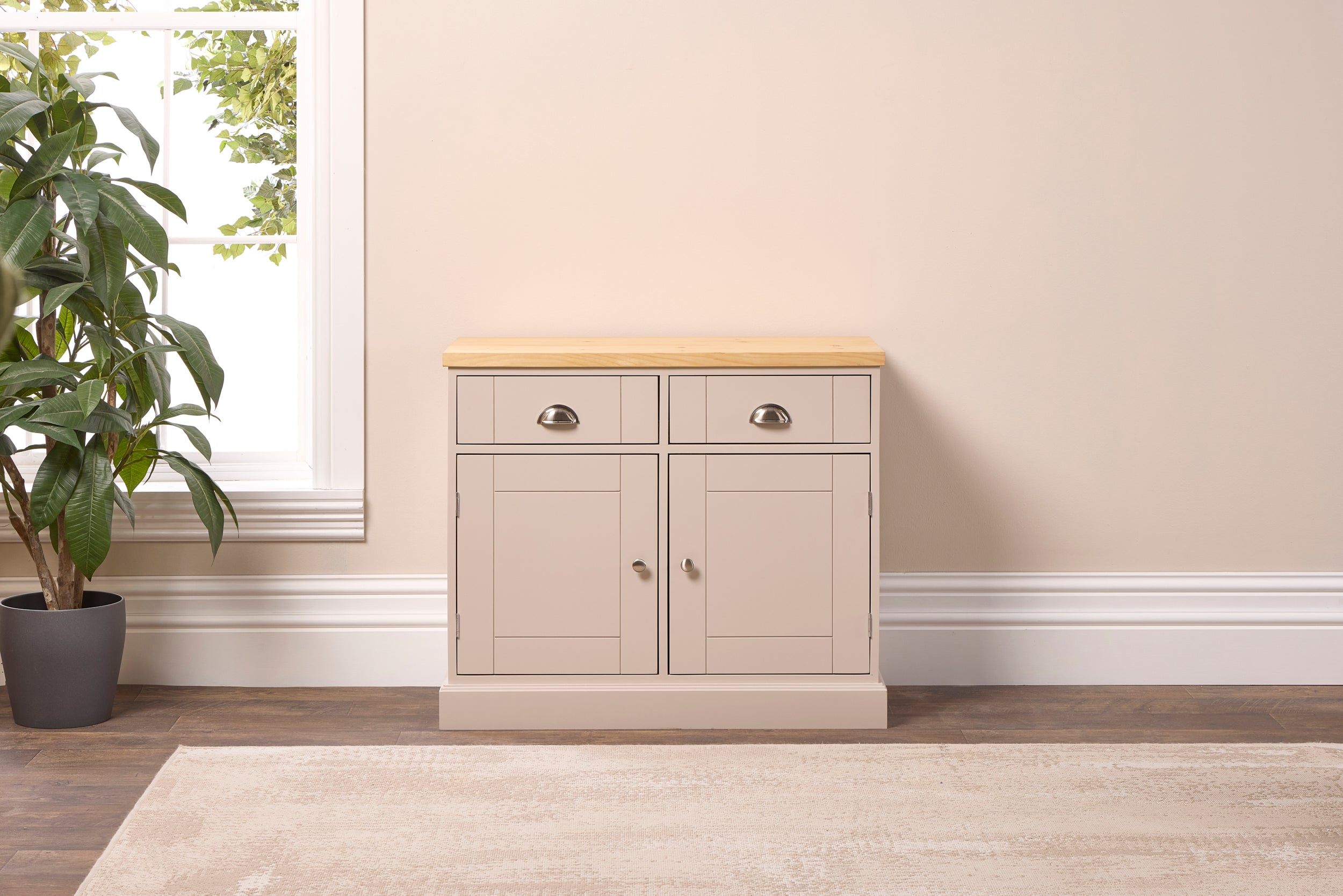Compact yet surprisingly spacious, our Kettlewell small sideboard table is the perfect solution for maximising storage in tight spaces without sacrificing style. Handcrafted in our Yorkshire workshop, this stunning painted sideboard unit features two drawers at the top, ideal for storing cutlery, linens, or smaller items like napkin rings or serving utensils. Additionally, the two cupboards below offer storage options for larger items such as dinnerware, serving platters, or even kitchen appliances. Whether you're organising your dining room essentials or decluttering your living space, the Kettlewell sideboard provides plenty of space to keep everything neatly tucked away while adding a touch of elegance to your home decor. The solid wood top adds a touch of warmth and elegance to the piece, providing a perfect display area for showcasing family pictures, a coffee machine, or other home decor accessories.