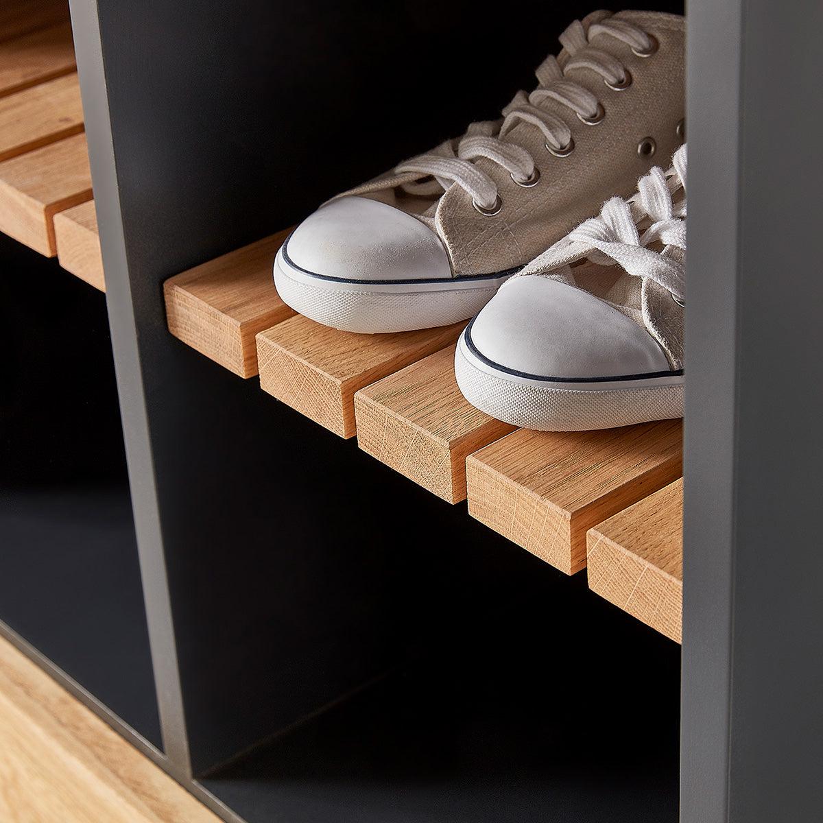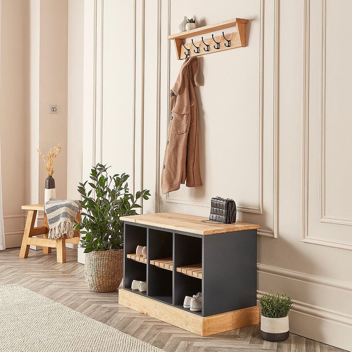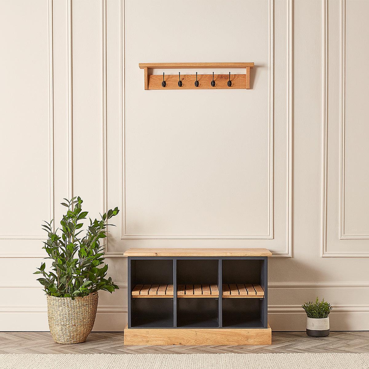 This painted shoe bench with oak seat is designed to bring practical storage and clean, contemporary style to your hallway. The painted base features six open compartments, providing organised storage for everyday footwear while keeping shoes easy to access.
