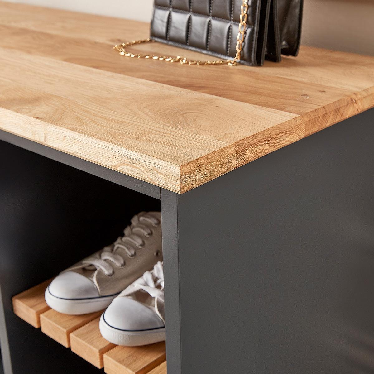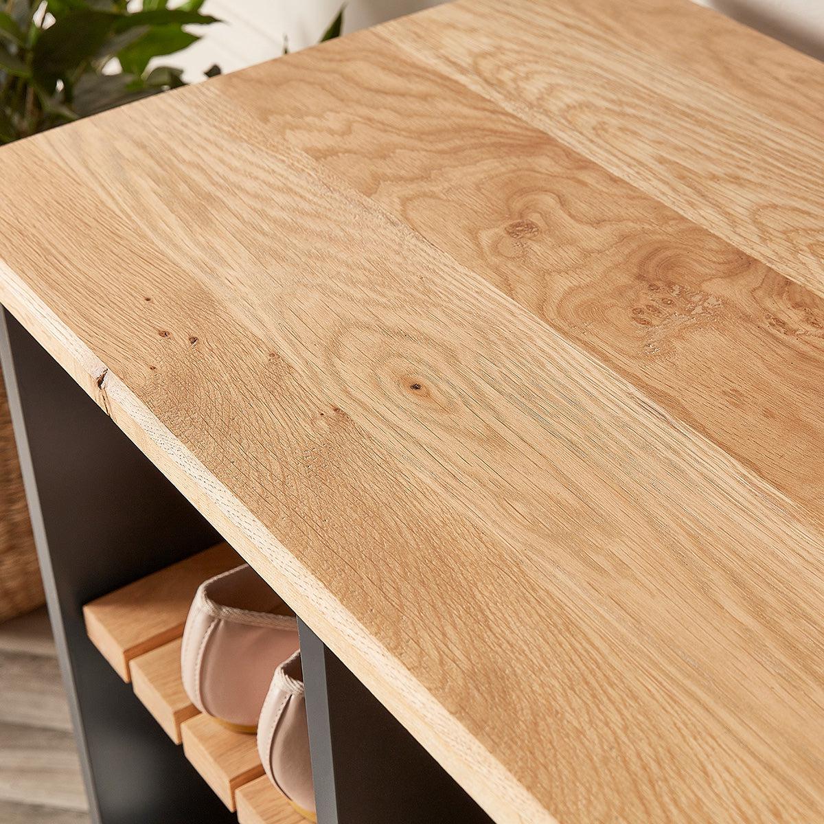 Above the painted body, the solid oak seat adds warmth and contrast while offering a comfortable place to sit when putting shoes on or taking them off. The combination of painted finish and natural oak makes this bench well suited to modern homes that need functional storage without visual clutter.