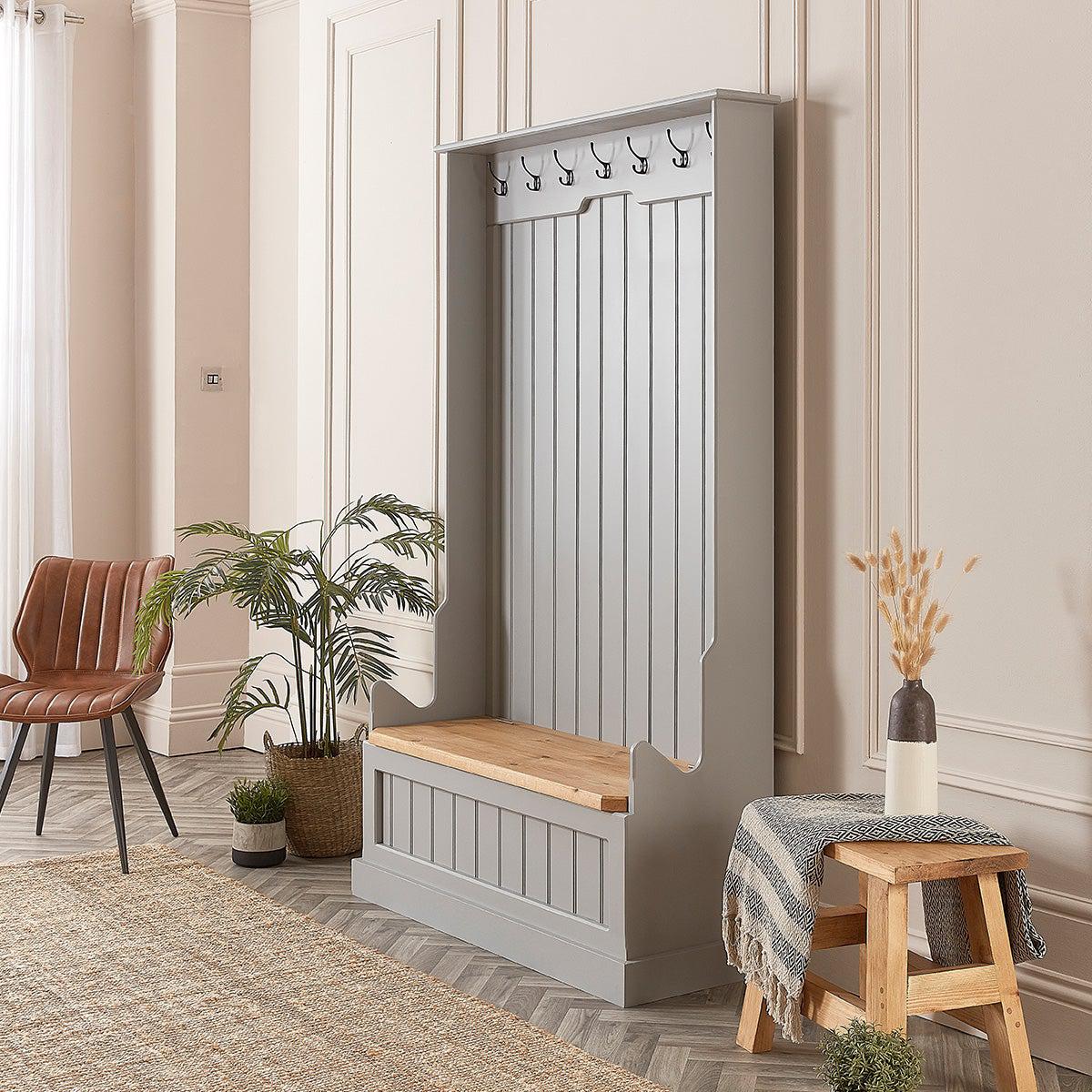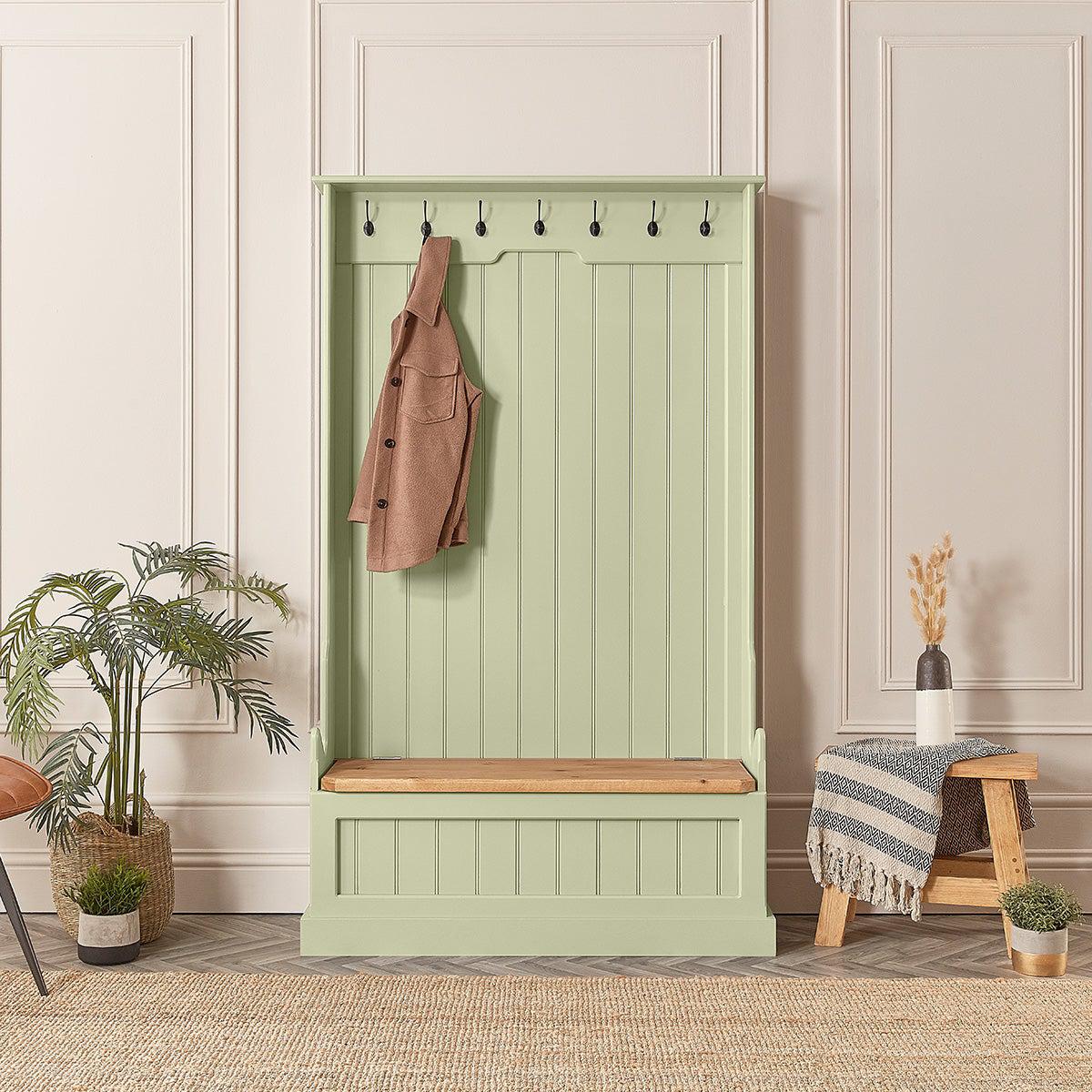 Add a beautiful centrepiece to your hallway with our painted Monks Bench. Skilfully handcrafted, this monks storage bench is guaranteed to draw admiring glances from visitors to your home. Designed to be both eye catching and practical, this hallway storage bench will help organise the most chaotic of hallways. The striking painted frame features seven heavy duty coat hooks, the ideal place to store your coats, scarves or bags and is supported beautifully by a wooden lifting bench seat with plenty of room for shoes and boots. ย
